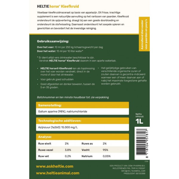 Heltie Horse Kleefkruid is een maceraat van kleefkruid op basis van appelazijn, zo is het geschikt als een gezonde toevoeging voor alle type paarden. Macereren geeft kleefkruid ruim de tijd om zijn plantaardige eigenschappen af te geven aan de appelazijn. Door deze traditionele bereidingswijze ontstaat een puur en krachtig, plantaardig product zonder onnodige toevoegingen.