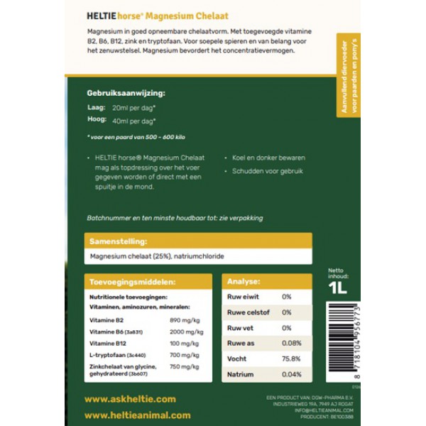 Door gebruik te maken van magnesium gebonden aan aminozuren (chelaatvorm), wordt dit supplement optimaal opgenomen in het lichaam van je paard.